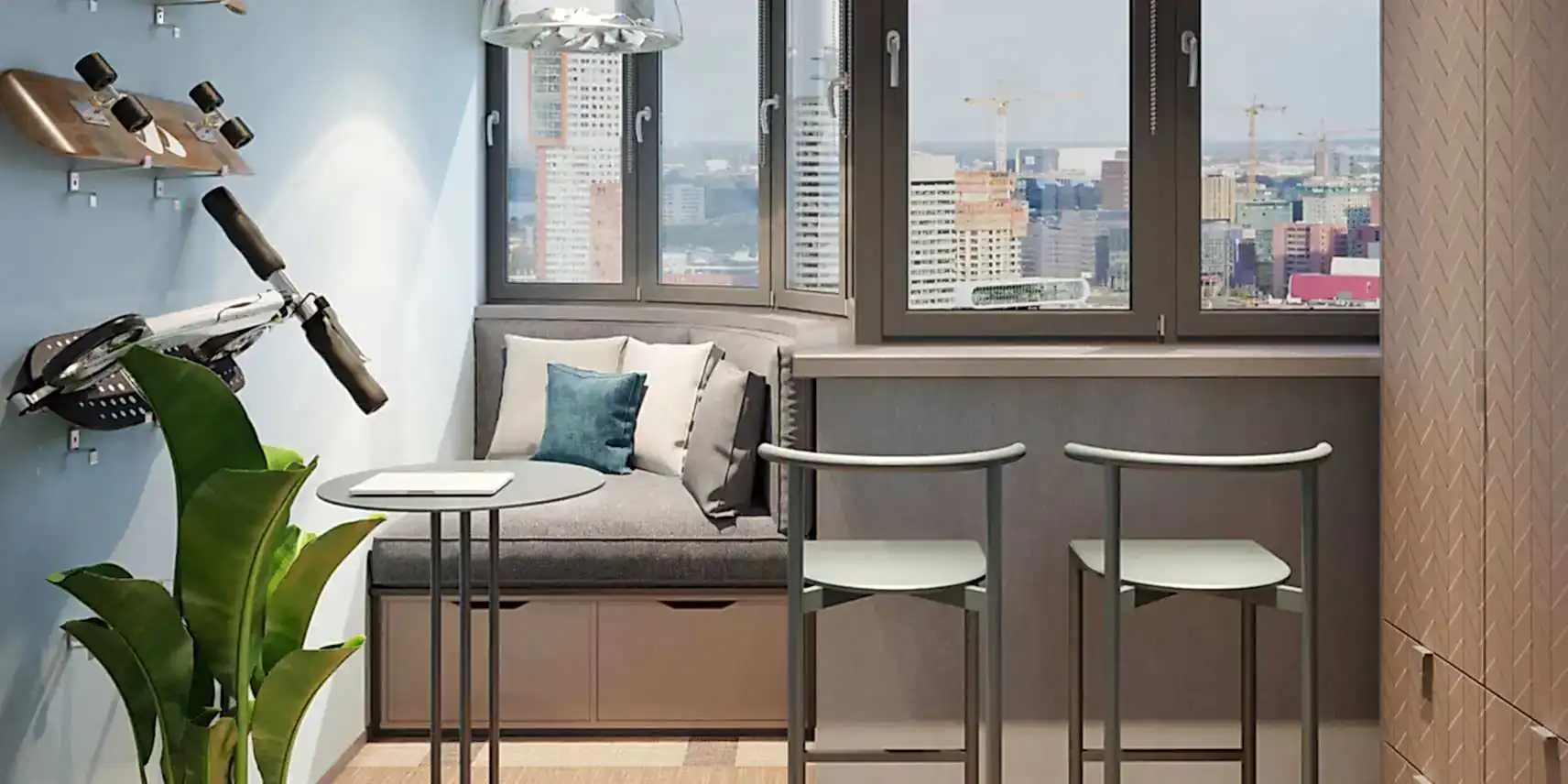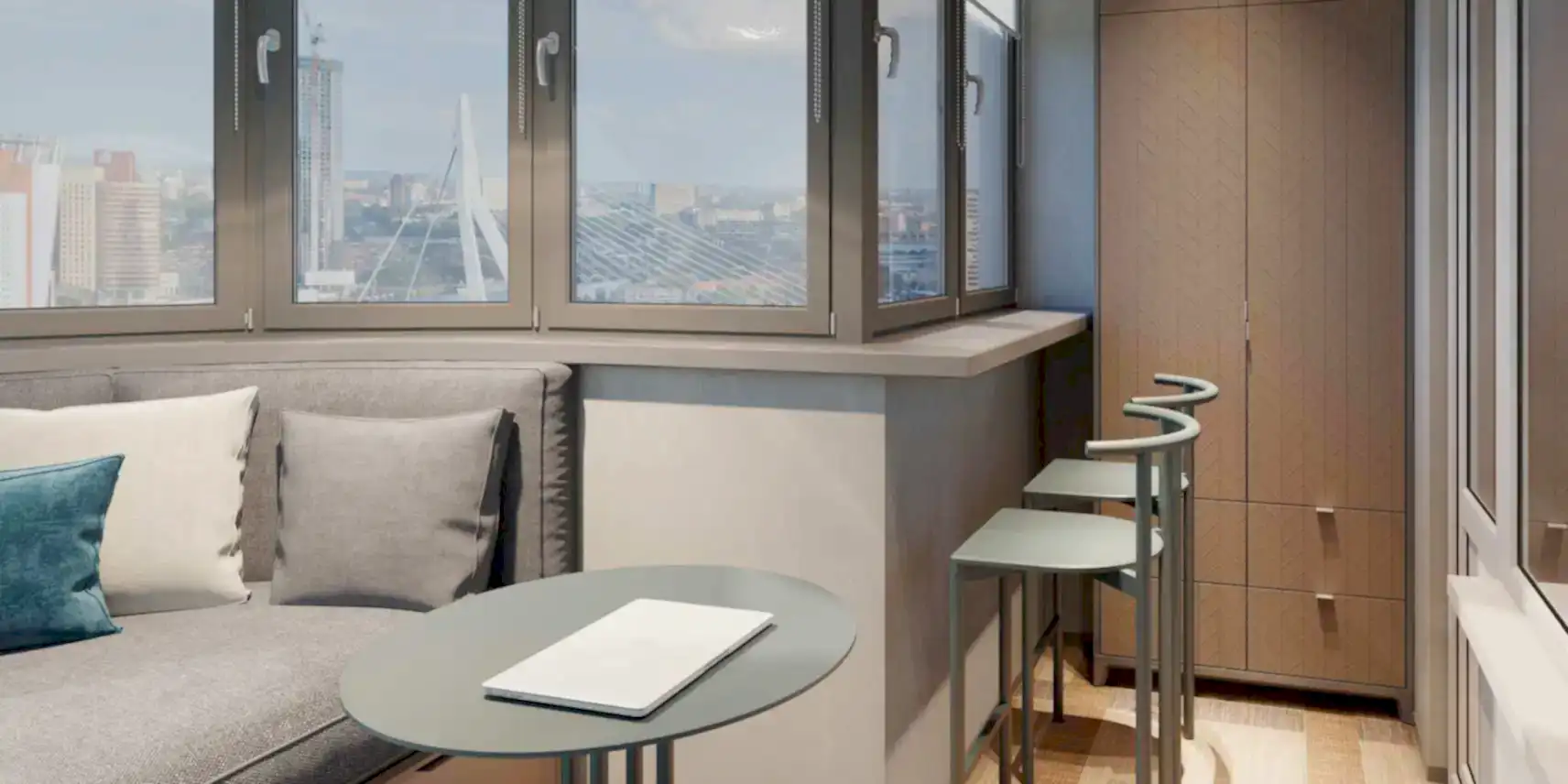 Теплое остекление сохранит комфортную температуру на балконе. Если на улице −15, то на лоджии будет +20 градусов. Такое Пинап для хранения станет полноценной гардеробной или продолжением спальни.